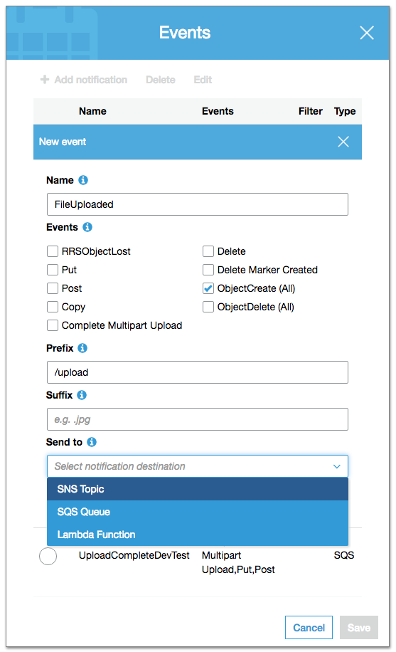 The only part that is left is notifying your backend once the file has been successfully uploaded. One option is to create another endpoint and to have client ping the server again to close the loop. That would mean another API call. Luckily, S3 can perform a custom action(event) for every object being created. The screen below show the available options. It can trigger a Lambda function, or it can send a message to SQS or SNS. Depending in our needs we can use one of these options to trigger further processing of the uploaded file, but that is outside the scope of this tutorial.