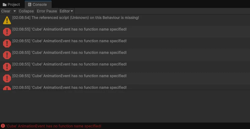 If that method name is left blank, typed incorrectly, or if the method or script was deleted, disabled, or moved, Unity won’t know what to trigger when the event fires. As a result, you’ll see the “Animation Event Has No Function Name Specified” error in the Console.