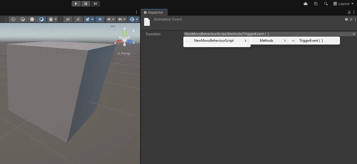 - In the Inspector, find the dropdown labeled Function. Choose a method from the list. The script containing this method must be attached to the same GameObject as the animation.