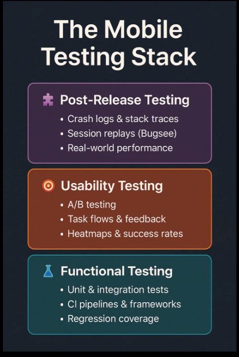 This shift reflects how mobile testing has evolved from a one-time QA phase to a continuous, layered system that spans design, development, deployment, and production.
