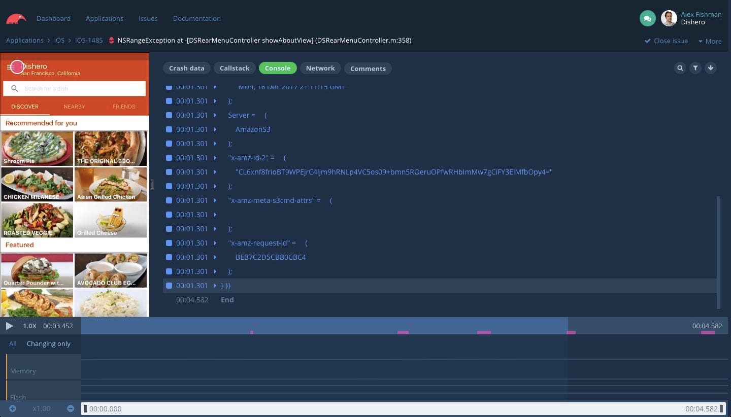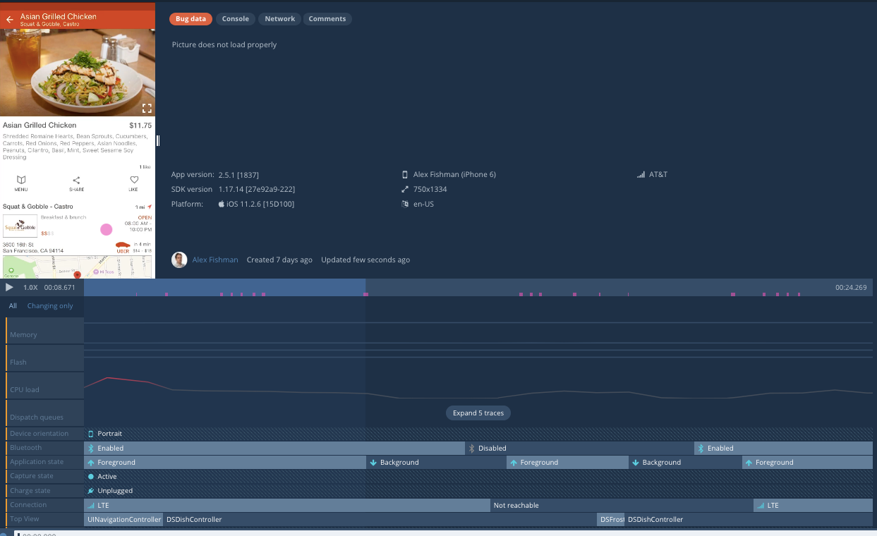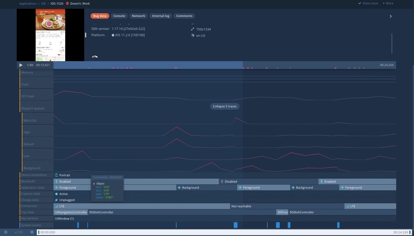 Bugsee continuously records all the console logs and shows them to you, synchronized to the video. This way, you’d know what the user had been seeing, where they were clicking and what your app was doing at the same time.