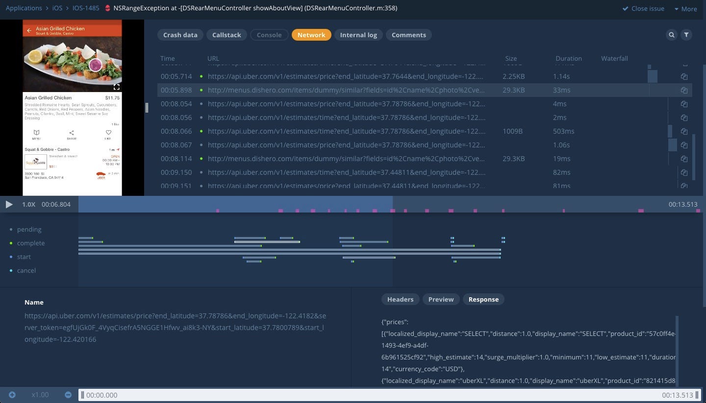That’s exactly what Bugsee is doing — we record all the network calls, to yours and 3rd party servers, including the body of the request. Again, everything is synchronized with the video of the user’s actions.