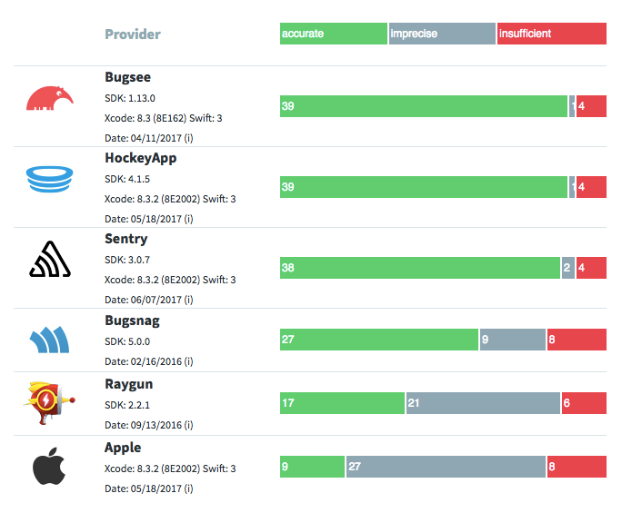 Our direct competitor — HockeyApp (owned by Microsoft) runs a website CrashProbe that compares the quality of various solutions’ symbolication skills (there are 22 types of different crashes on iOS on 2 platforms — 32 and 64 bits, so 44 different cases).