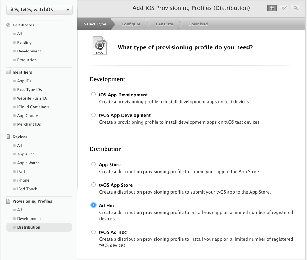 Follow the pictures below to create an Ad-Hoc provisioning profile, and add all the devices to it. Download it once ready and install in your local keychain by double-clicking on it.